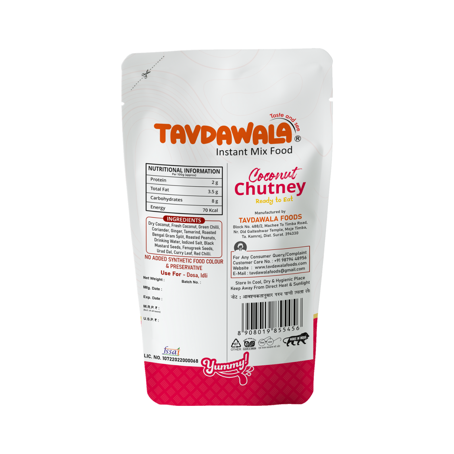 Dry Coconut, Fresh Coconut, Green Chilli, Coriander, Ginger, Tamarind, Roasted Bengal Gram Split, Roasted Peanuts, Drinking Water, lodized Salt, Black Mustard Seeds, Fenugreek Seeds, Urad Dal, Curry Leaf. Red Chilli